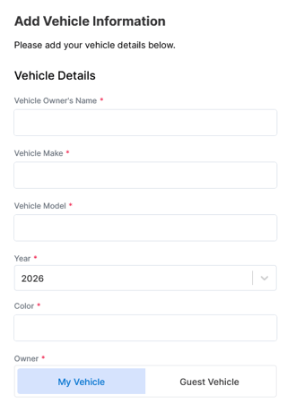 - Fill in your vehicle details: Vehicle Owner's Name, Vehicle Make, Vehicle Model, Year, Color, and select whether this is My Vehicle or a Guest Vehicle.